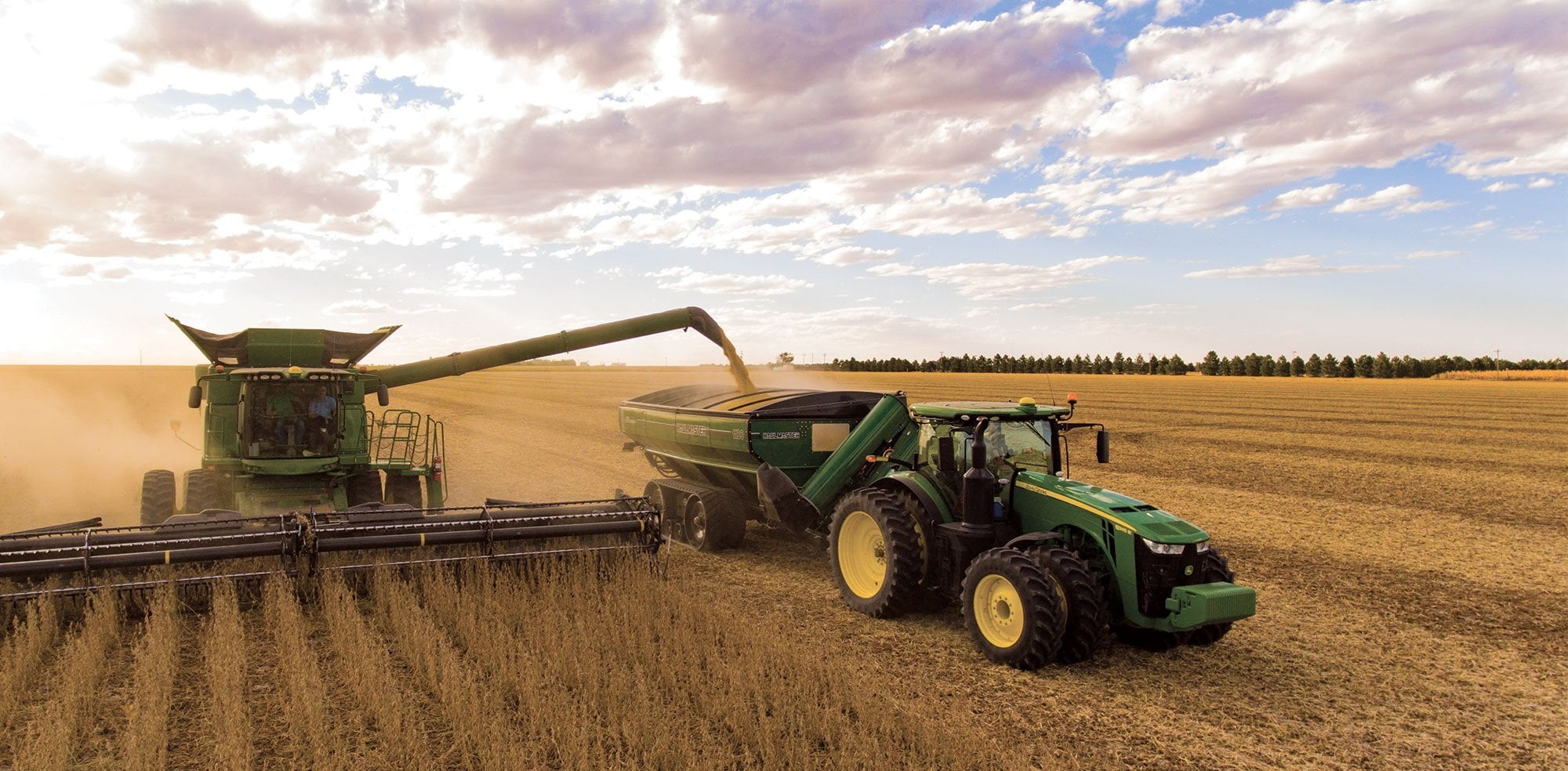 The use of this cart results in a 25% increase in harvest efficiency. It enables the combine to pick up the grains without stopping. Also known as an augur cart, it seamlessly brings crops from the combine to the truck at the end of the field.